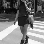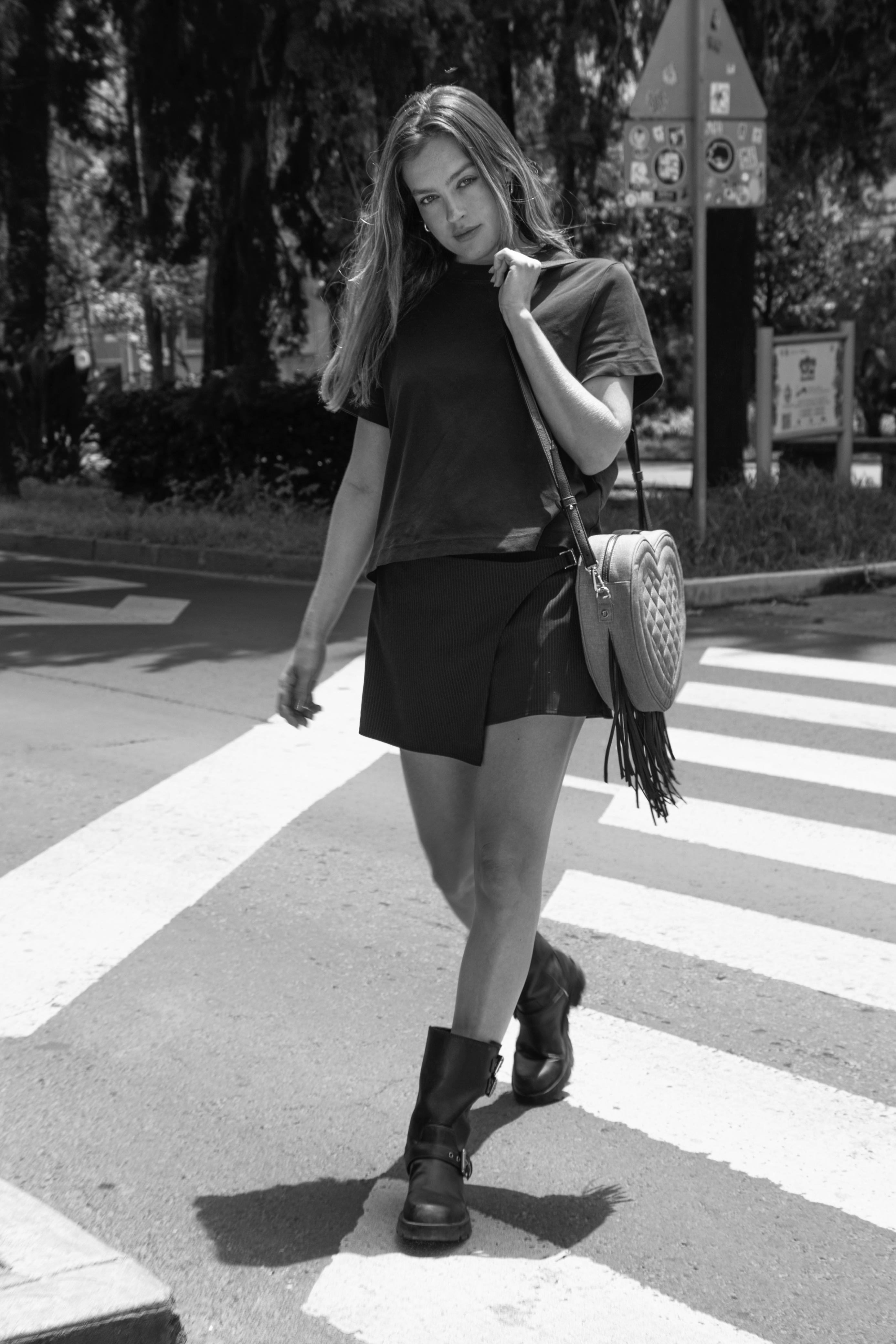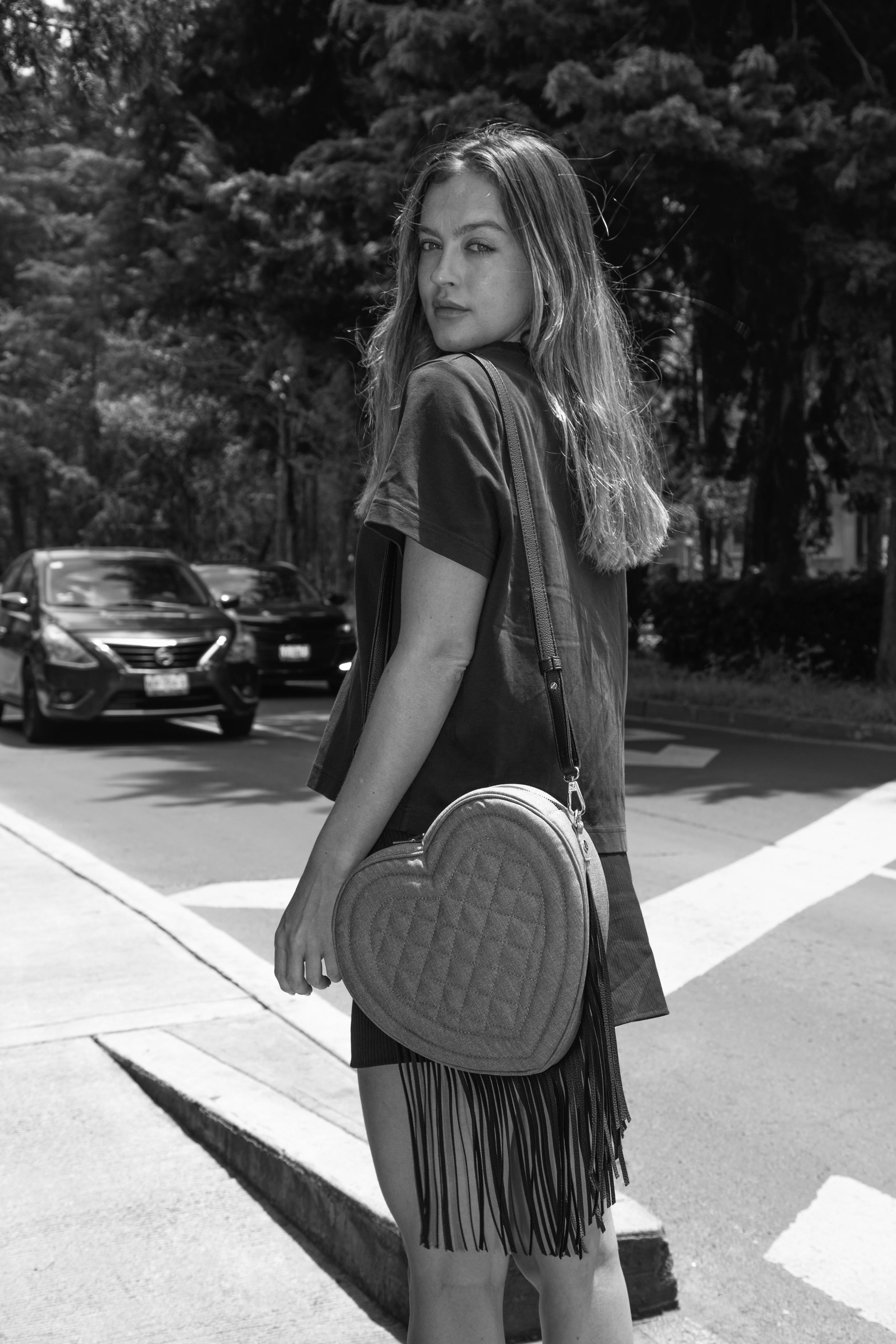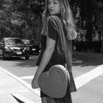 Un exquisito modelo en forma de corazón con un patrón de rombos elaborado en lino, con unas distintivas tiras de cuero negro que cuelgan desde la base.