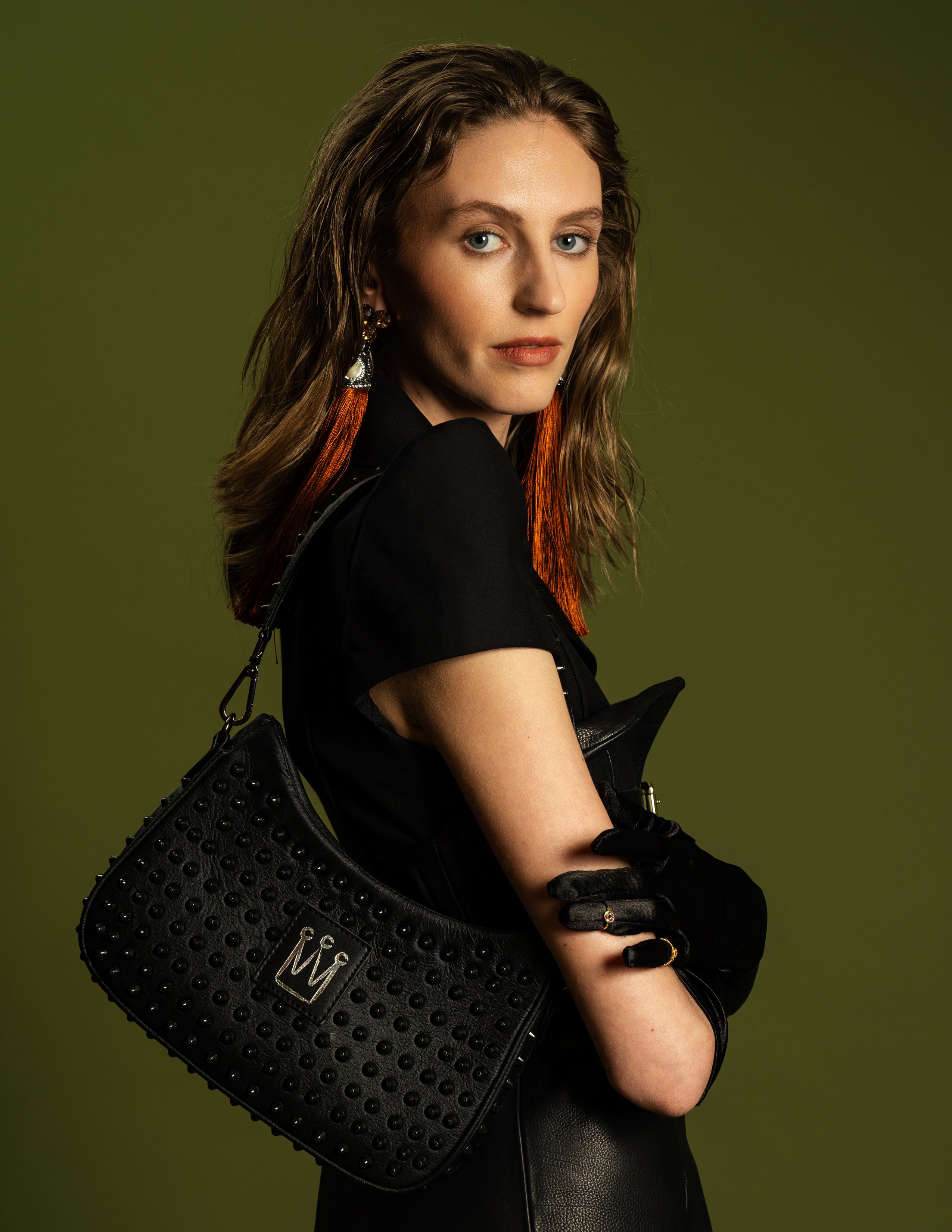 Diseño confeccionado en cuero vegano. Este modelo en color negro presenta una figura curva. Incluye 3 correas extraíbles: una correa larga con remaches negro, una corta para llevar al hombro y una cadena corta.